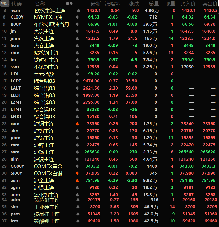 隔夜内外盘金属普涨,仅伦锡和沪锡一同下跌,伦锡跌0.08%,沪锡跌0.09%。伦铅、伦锌一同涨逾1%,伦铅涨1.19%,伦锌涨1.34%。伦铝涨2.3%,其余金属涨幅均在1%以内。氧化铝主连涨1.4%,铸造铝主连涨0.77%。