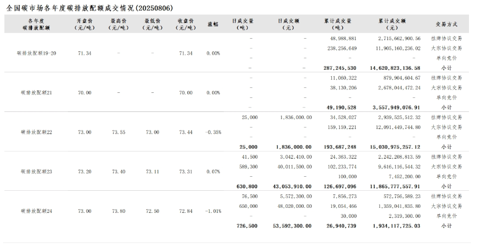2025年1月1日至8月6日,全国碳市场碳排放配额成交量53,492,477吨,成交额3,976,915,650.04元。