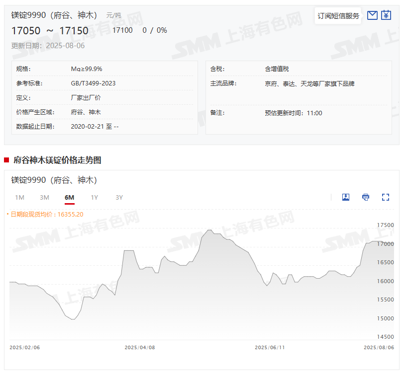 进入下半年以来,镁价重心整体呈现上移态势。8月6日,镁价呈现上行态势,主产区90镁锭主流成交价区间为17100-17200元/吨,较前一交易日上调50元/吨。
