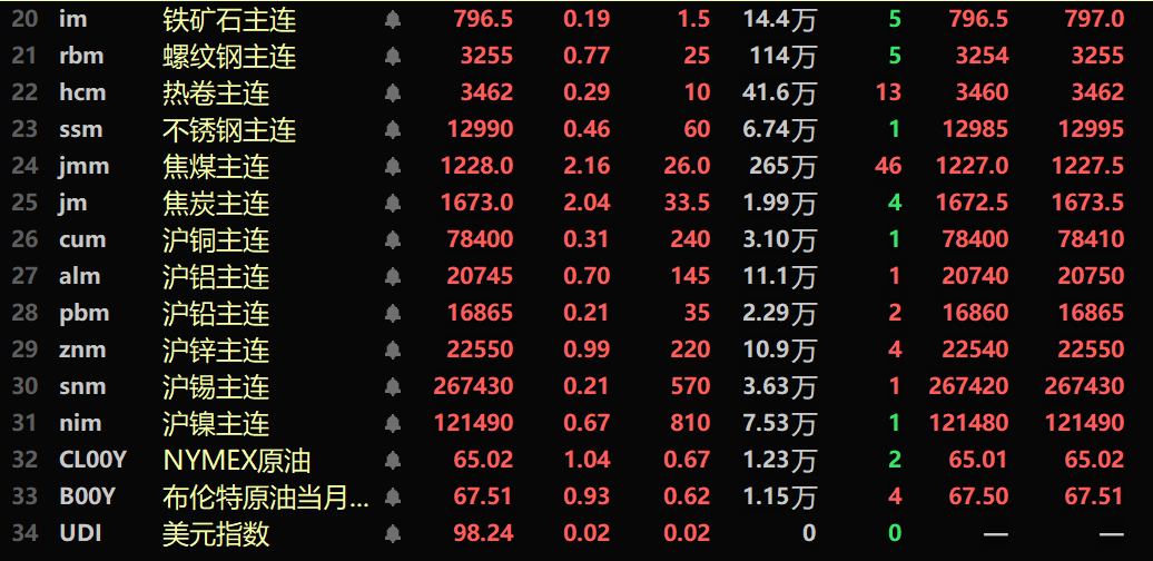 黑色系均飘红,铁矿涨0.19%,螺纹涨0.77%,热卷涨0.29%。不锈钢涨0.46%。双焦方面:焦煤主力合约涨2.16%,焦炭主力合约涨2.04%。