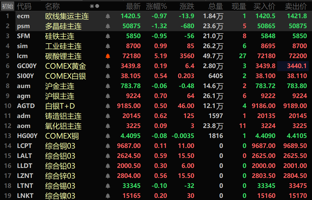 此外,铸造铝主连期货和氧化铝主连分别涨0.62%、0.09%。碳酸锂主连涨5.19%,工业硅主连涨0.19%。多晶硅主连跌1.32%。