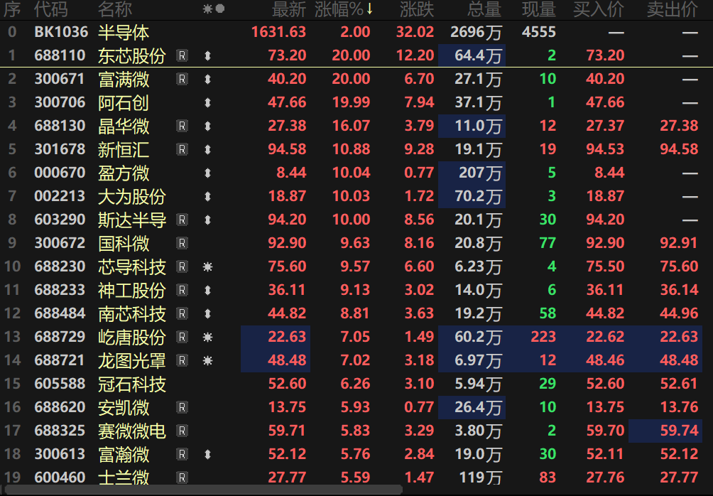 个股方面,富满微盘中20CM涨停,东芯股份一度涨逾18%,阿石创、新恒汇、芯导科技一同涨逾10%,盈方微涨10.04%涨停,屹唐股份、大为股份等多股纷纷跟涨。