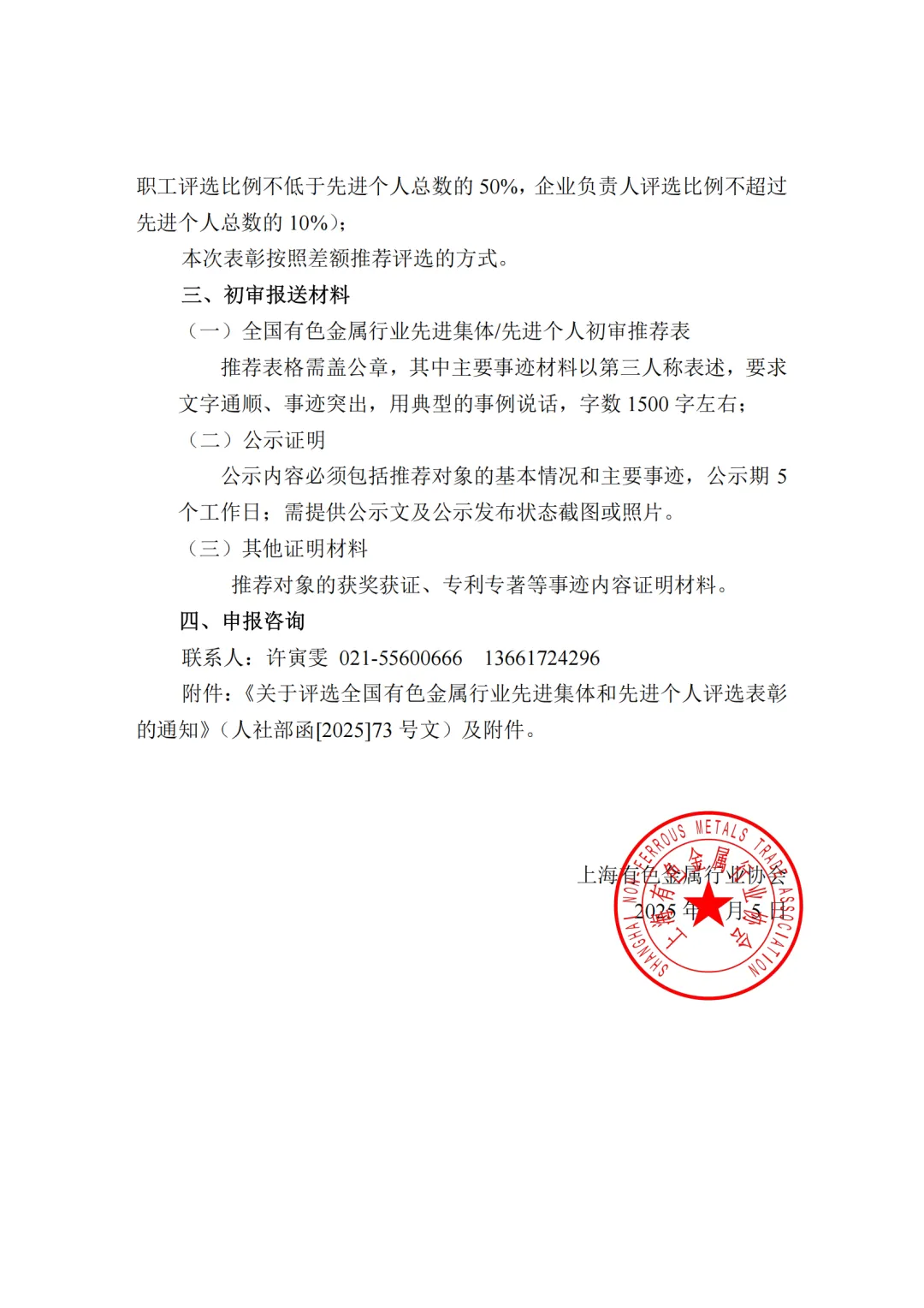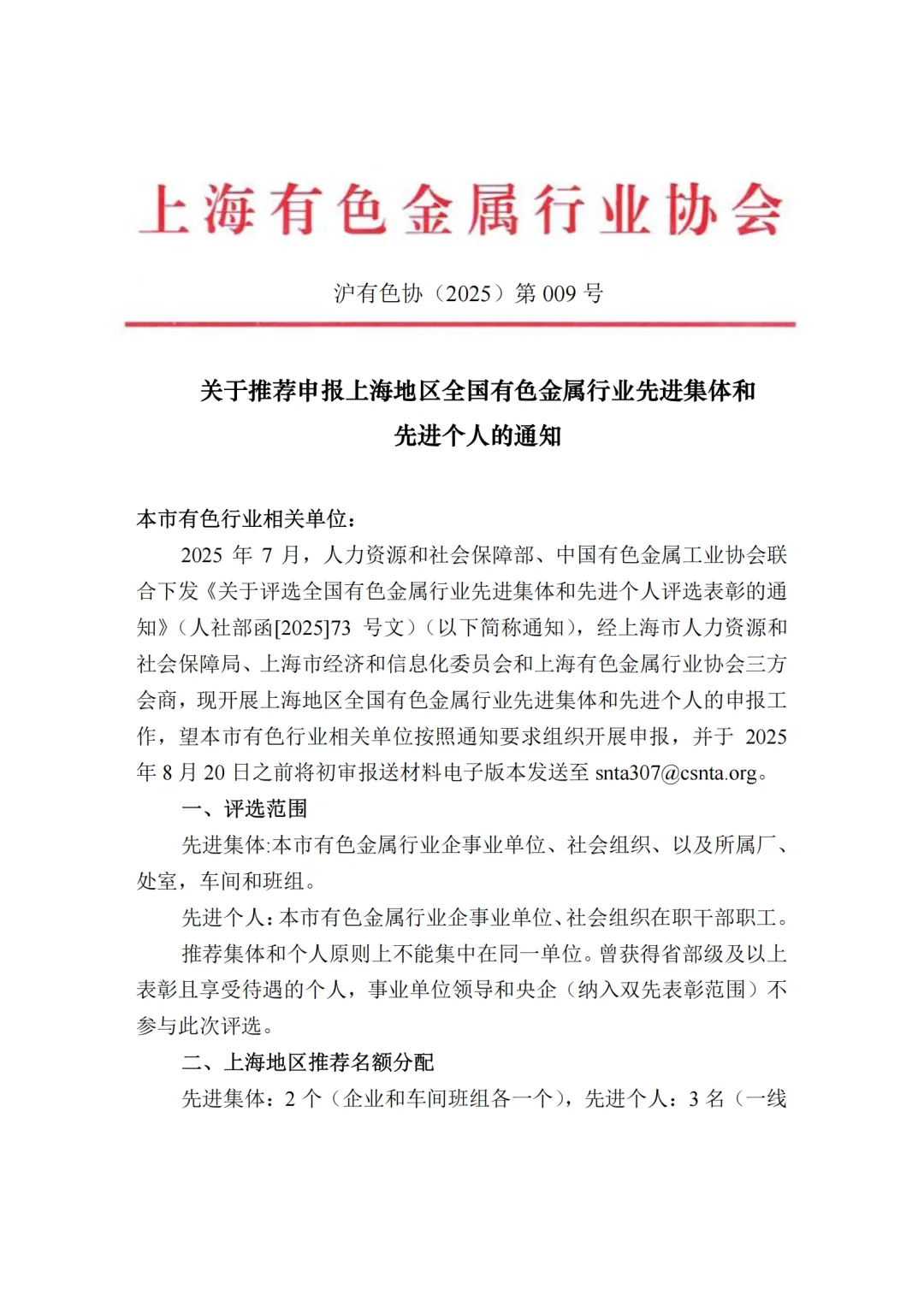 关于推荐申报上海地区全国有色金属行业先进集体和先进个人的通知