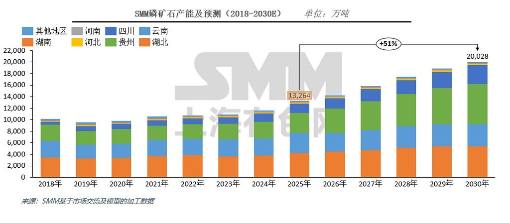 中国磷矿产能主要集中在湖北、云南、贵州、四川四省,合计占比超全国总量的80%。近年来,随着贵州摩天冲(250万吨/年)、四川雷波县新探资源(1.3亿吨)、新能源关联企业配矿等项目的开发,西南地区产能持续提升。SMM预测,2025年磷矿石产量预计达1.19亿吨,同比增长4.8%,但长期增速可能受资源禀赋下降和环保政策限制。