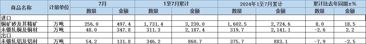 中国7月未锻轧铜及铜材进口量为48.0万吨,1-7月累计进口量为311.3万吨,同比减少2.6%。