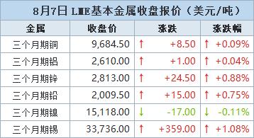 伦敦时间8月7日17:00(北京时间8月8日00:00),LME三个月期铜上涨8.5美元,或0.09%,收报每吨9,684.5美元。