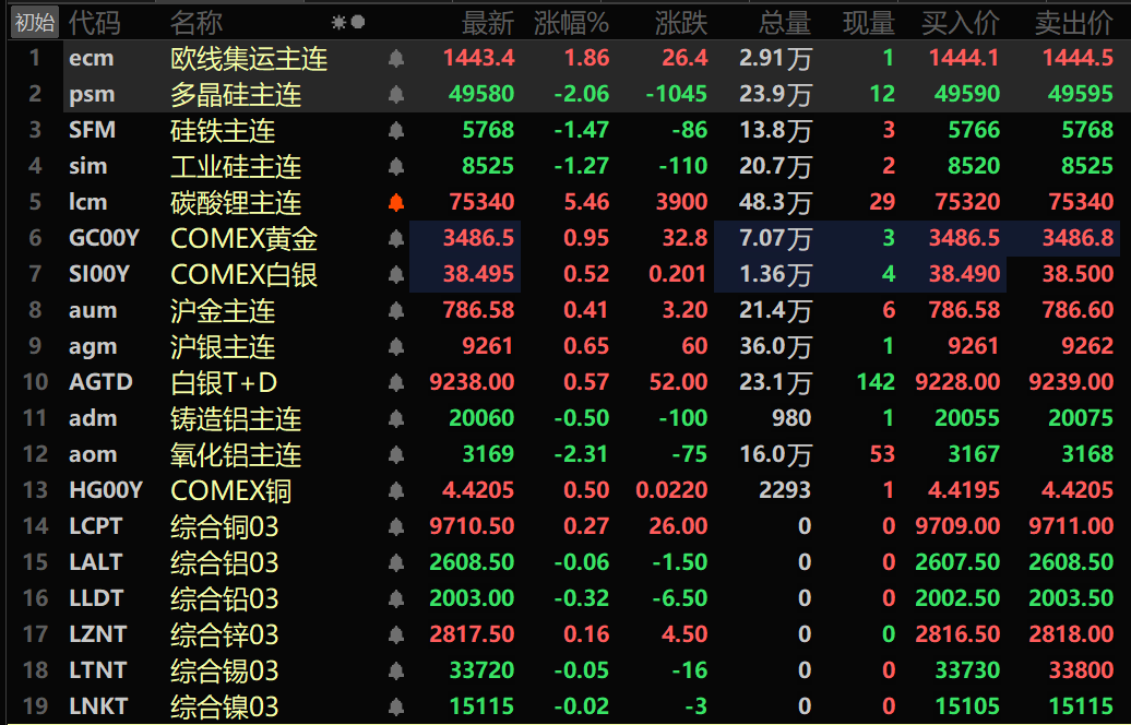 此外,铸造铝主连期货和氧化铝主连分别跌0.5%、2.31%。碳酸锂主连涨5.46%,工业硅主连跌1.27%。多晶硅主连跌2.06%。