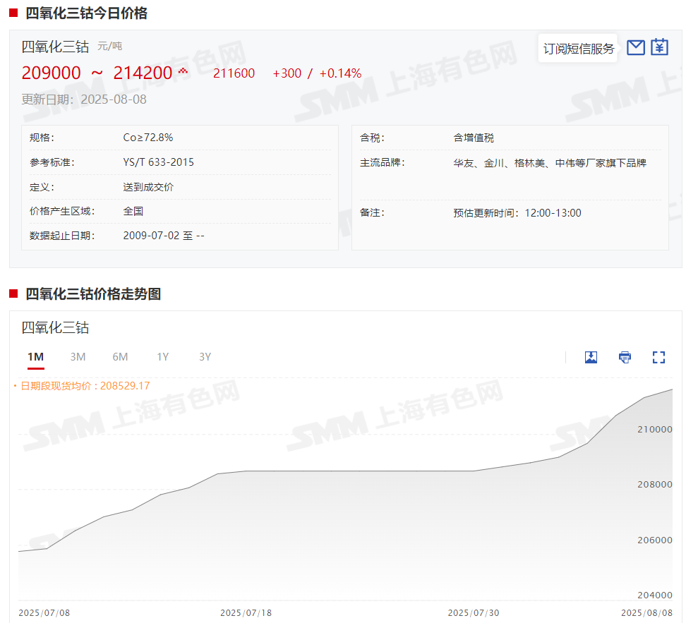 据SMM现货报价显示,四氧化三钴现货报价在本周同样呈现震荡上涨的态势,截至8月8日,四氧化三钴现货报价涨至20.9~21.42万元/吨,均价报21.16万元/吨,较8月1日上涨2650元/吨,涨幅达1.27%。