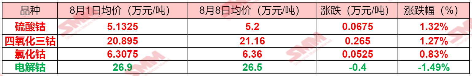 SMM 8月8日讯: 本周钴系产品现货报价多上涨,仅电解钴报价唯一下跌,尽管已有冶炼厂减产甚至停产,维持挺价,但疲软的需求依旧令电解钴承压走低。硫酸钴、四氧化三钴现货报价则继续上涨,原材料价格抬升带动硫酸钴和四氧化三钴冶炼厂维持挺价……SMM整理了本周钴系产品价格变动情况,具体如下: