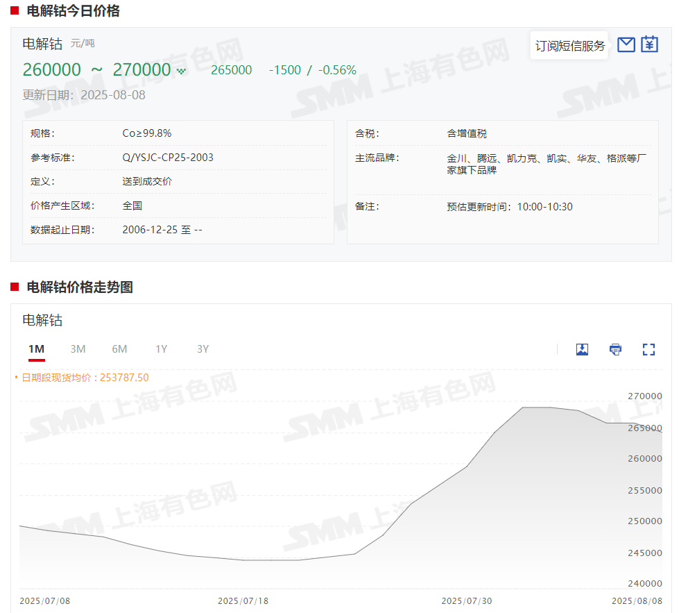 据SMM现货报价显示,本周电解钴现货报价整体呈现震荡下跌的态势,截至8月8日,电解钴现货报价跌至26~27万元/吨,均价报26.5万元/吨,较8月1日跌去4000元/吨,跌幅达1.49%。