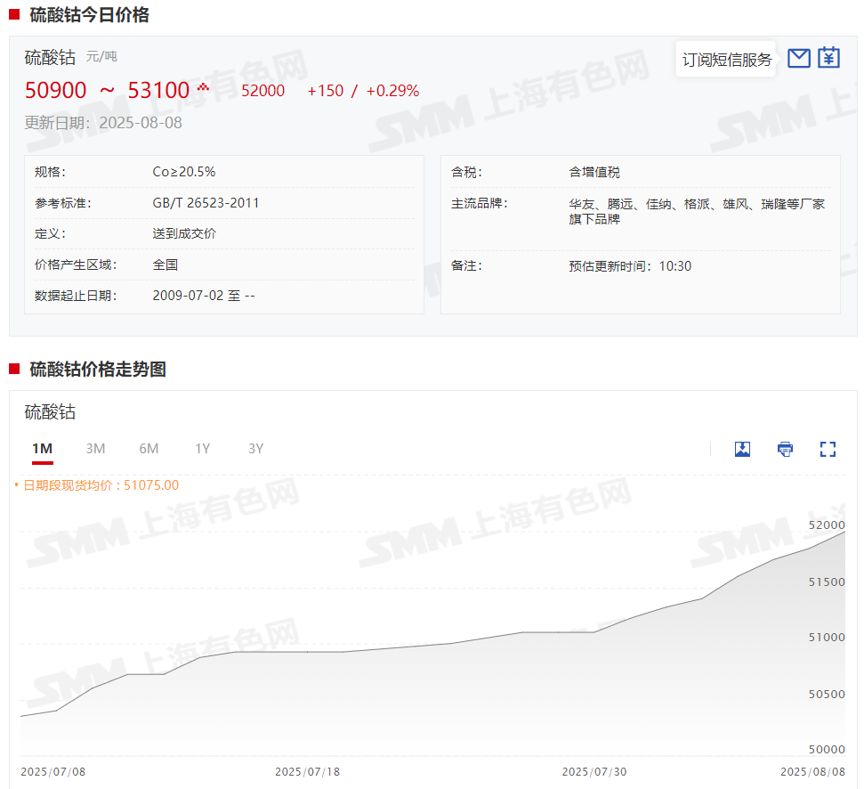 据SMM现货报价显示,硫酸钴现货报价本周呈现接连上涨的态势,截至8月8日,硫酸钴现货报价涨至50900~53100元/吨,均价报52000元/吨,较8月1日上涨675元/吨,涨幅达1.32%。