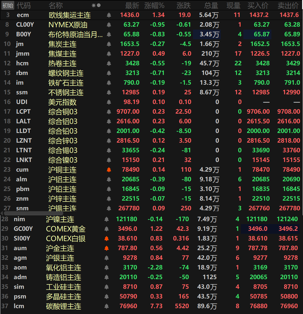 此外,碳酸锂主连大涨7.73%,录得三连阳。工业硅涨0.87%,多晶硅涨0.33%。欧线集运主连涨1.34%报1436。