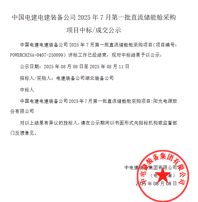 8月8日,中国电建电建装备公司2025年7月第一批直流储能舱采购项目中标/成交公示,阳光电源股份有限公司中标该项目。