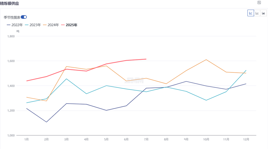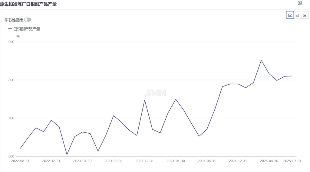 2025年7月白银产量延续增势,环比6月增加约1.4%。由于7月银价刷新高,铅冶炼厂副产品收益可观,铅冶炼厂白银副产品产量同样录得正增长。