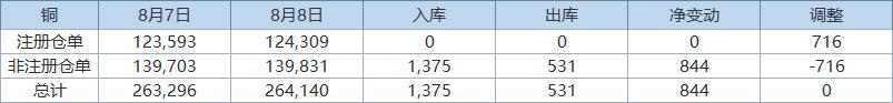 8月8日COMEX铜库存为264,140短吨,入库1,375短吨,出库531短吨,净增加844短吨,未作调整。