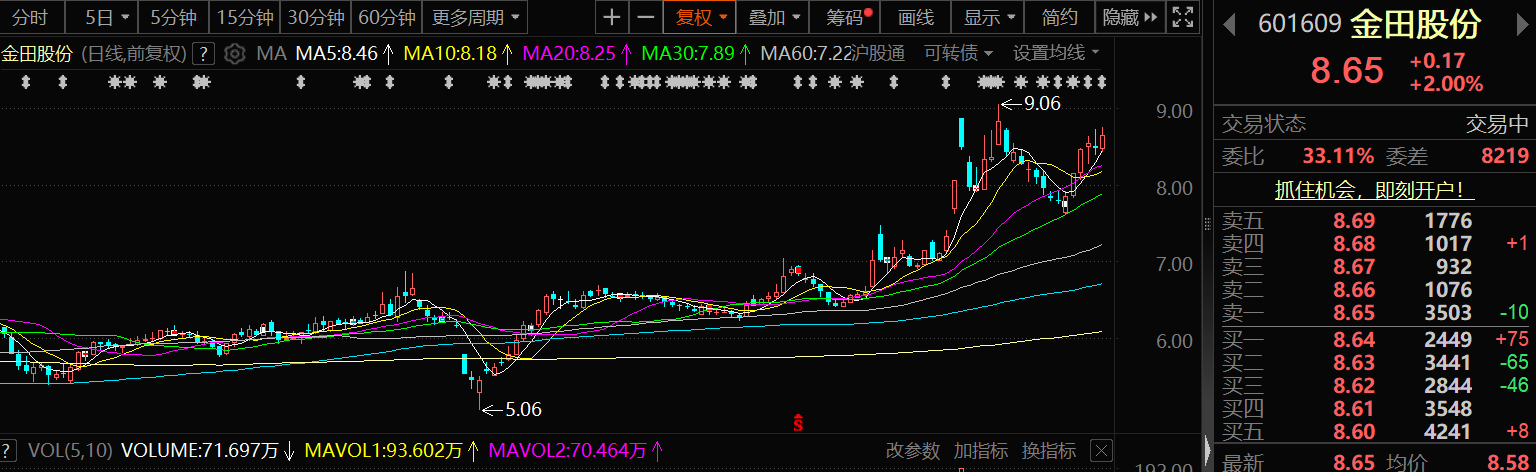 8月11日,金田股份的股价出现上涨,截至11日13:59分,金田股份涨2%,报8.65元/股。