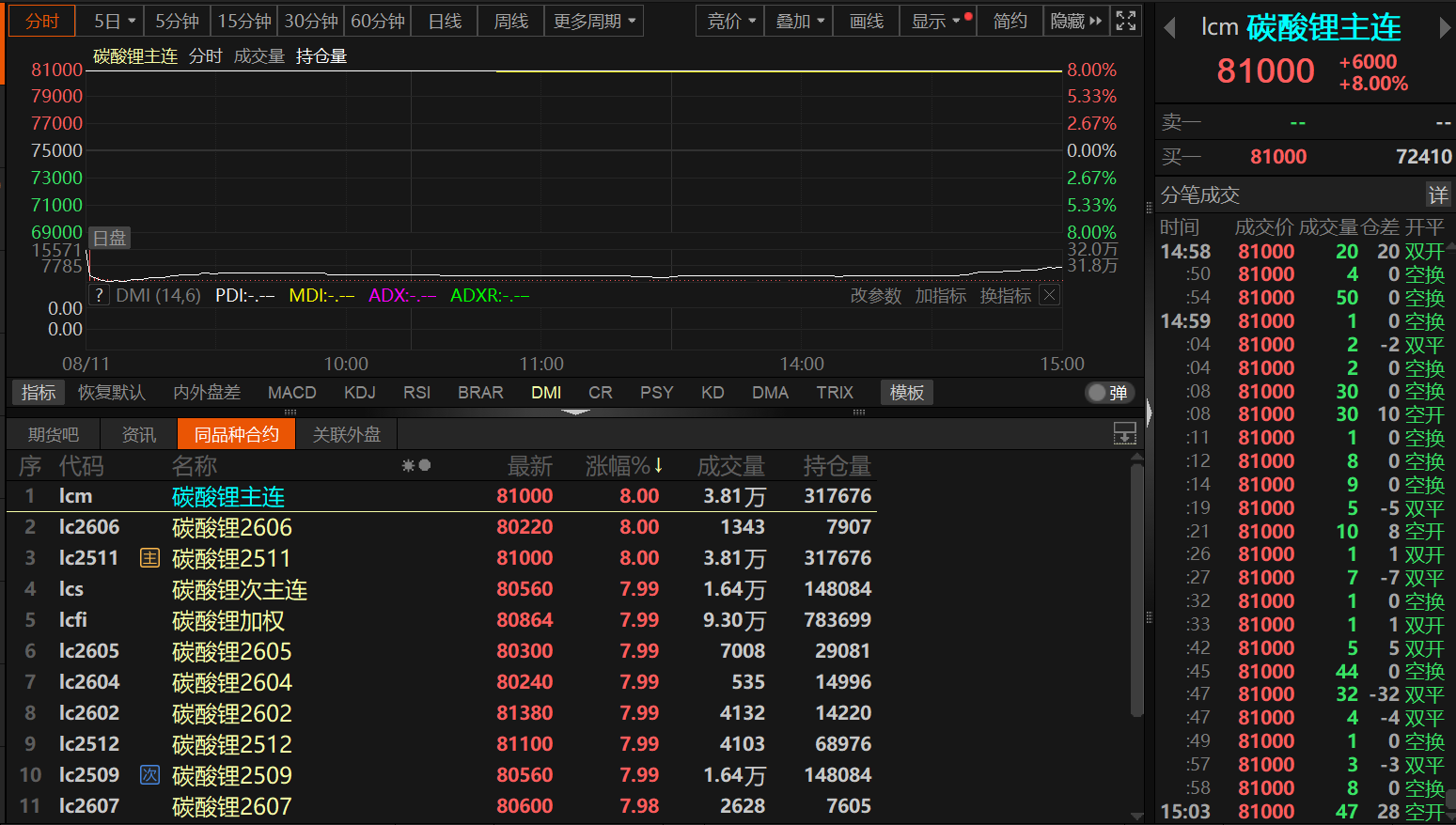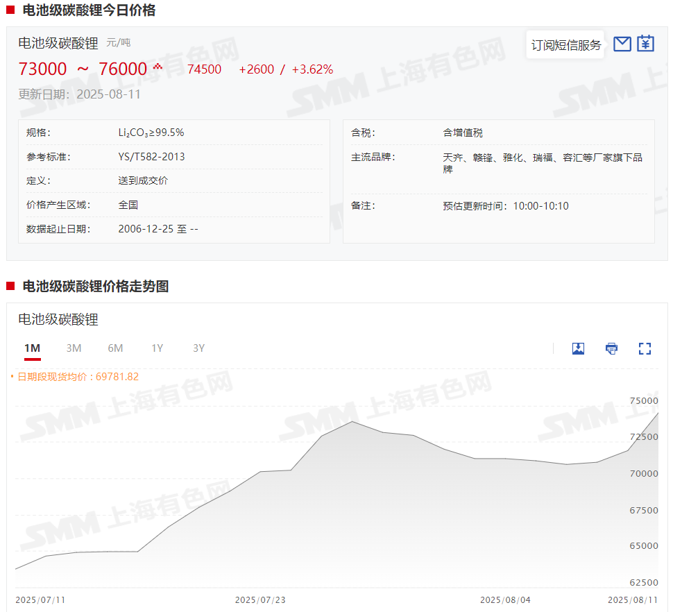 SMM 8月11日讯:8月11日早间,受宁德时代宜春项目采矿许可证到期暂停开采消息刺激,碳酸锂期货主连开盘即涨停,以8%的涨幅报81000元/吨,刷新7月28日以来的新高。碳酸锂期货其余合约也均一同封死涨停板。