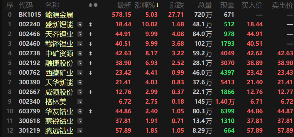 受宁德时代该锂矿停产消息刺激,今日能源金属板块也在开盘之后持续拉升,指数盘中涨幅超过5%,盘中最高触及581.06的高位,刷新2023年8月以来的近两年新高。个股方面,盛新锂能、天齐锂业、赣锋锂业盘中一同封死涨停板,中矿资源、融捷股份等多股纷纷跟涨。
