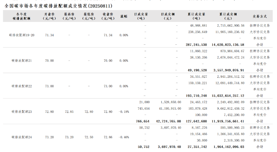 2025年1月1日至8月11日,全国碳市场碳排放配额成交量54,871,984吨,成交额4,062,618,124.54元。