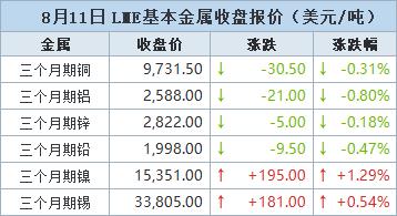 伦敦时间8月11日17:00(北京时间8月12日00:00),LME三个月期铜下跌30.5美元,或0.31%,收报每吨9,731.5美元。
