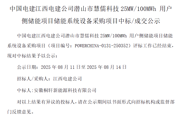 根据此前招投标信息,该储能项目位于安徽省潜山市慧儒科技园园区内,储能容量为25MW/100MWh,选用直流侧最高电压1500V方案,中国电建江西电建与中庚工程技术有限公司、智信能源组成的联合体以单价0.81元/Wh中标该项目的EPCO,总投标报价8100万元。