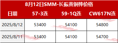 【SMM价格】2025年8月12日长振黄铜棒价格