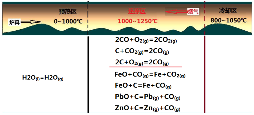 回转窑处理含锌粉尘是一个逆流换热、固-固还原反应过程,产生的锌蒸汽进入烟气,还原后炉料的金属化率可以达到60%~80%。