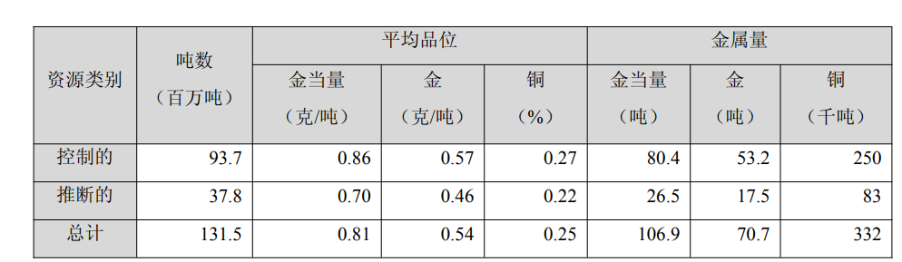 注:(1)矿产资源是根据原地资源报告的。估计结果仅用于测试地下开采具备“最终合理经济开采前景”的条件,并不代表矿石储量。 (2)所有数字都进行了四舍五入,以反映估算的相对准确性。显着差异是由于四舍五入引起的。 (3)用于矿产资源量估算的基本假设:金价每盎司3,100美元,铜价每吨11,000美元,当量系数(铜到金)1.1铜:1金,金当量边界品位0.4克/吨。