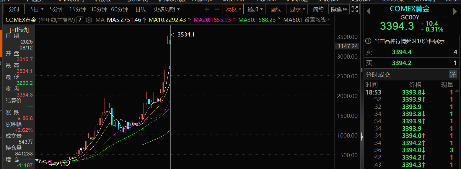 COMEX黄金2025年上半年的半年线涨幅为25.52%,其上半年刷新了COMEX黄金的历史新高至3509.9美元/盎司;而截至8月12日19:04分,COMEX黄金跌0.31%,报3394.3美元/盎司,COMEX黄金下半年的半年线涨幅暂时为2.62%。