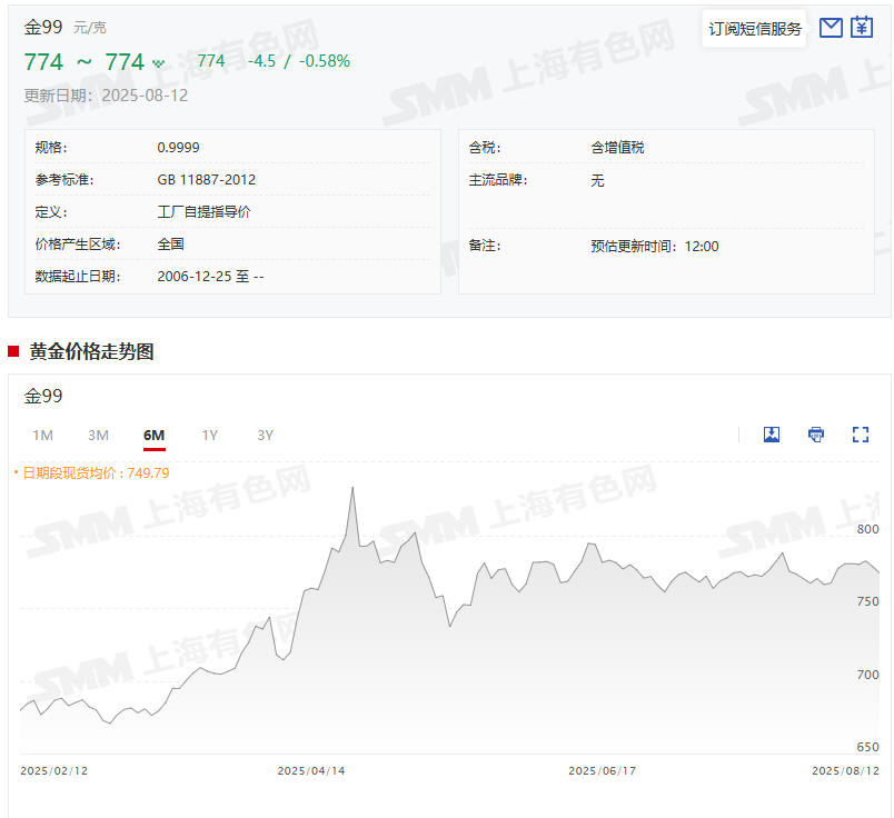 金99现货6月30日的均价为761元/克,与2024年12月31日的均价614.4元/克相比,涨幅为23.86%。而其8月12日的均价为774元/克,与前一交易日相比下降了0.58%。