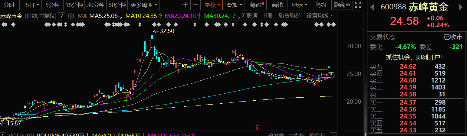 8月12日,赤峰黄金股价出现上涨,截至12日收盘,赤峰黄金涨0.24%,报24.58元/股。