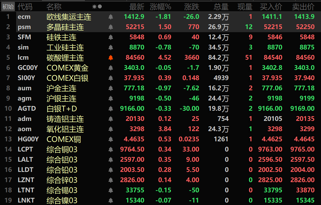 此外,铸造铝主连期货涨0.12%,氧化铝主连涨3.84%。碳酸锂主连延续前四个交易日的涨势继续涨4.52%,工业硅主连跌0.78%。多晶硅主连涨1.5%。
