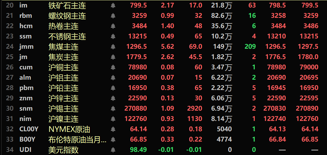 黑色系均飘红,铁矿涨2.17%,螺纹涨0.99%,热卷涨1.4%。不锈钢涨0.49%。双焦方面:焦煤主力合约涨5.62%,焦炭主力合约涨2.62%。