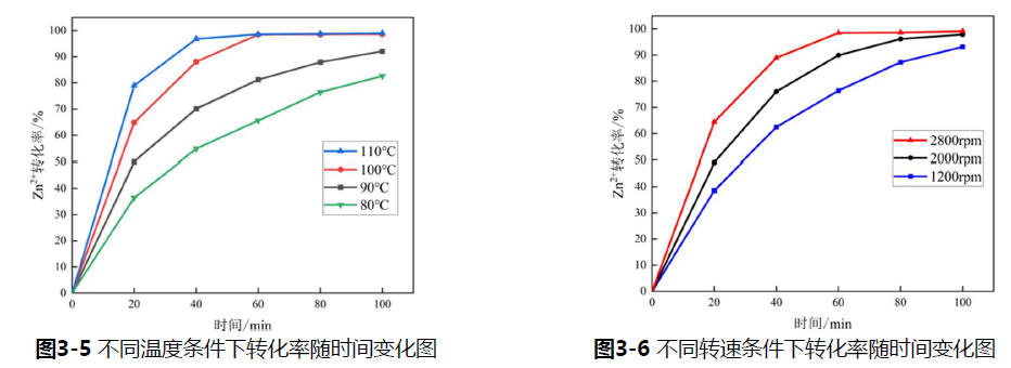 最终得出结论,蒸氨温度为85℃、蒸氨时间50min 、初始Zn2+ 浓度1.2mol/L、搅拌速率800rpm,此时转化率为98.44%。