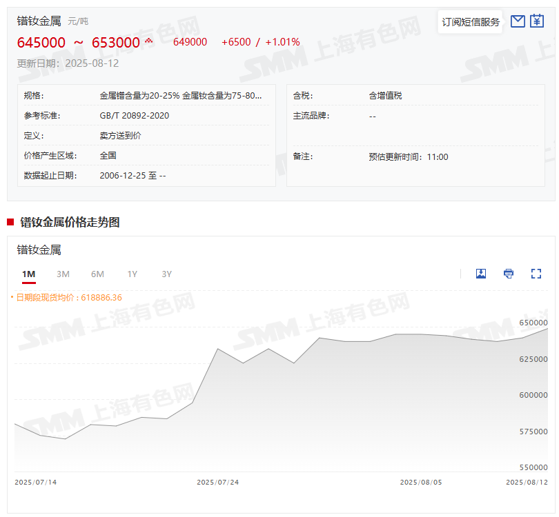 8月12日,稀土产业链价格延续了近期的积极态势,整体呈现上涨趋势,其中氧化镨钕和镨钕金属表现尤为突出,在继前一个交易日上涨之后继续走高。具体来看,氧化物市场中,氧化镨钕价格上调至53-53.3万元/吨,氧化镝价格上调至161-163万元/吨,氧化铽价格则稳定在700-704万元/吨;金属市场里,镨钕金属价格上调至64.5-65.3万元/吨,镝铁合金价格稳定在156-158万元/吨,金属铽报价稳定在865-870万元/吨。