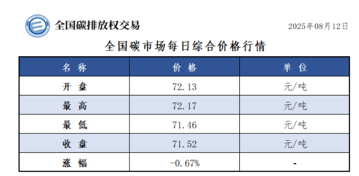 今日全国碳市场综合价格行情为: 开盘价72.13元/吨,最高价72.17元/吨,最低价71.46元/吨,收盘价71.52元/吨,收盘价较前一日下跌0.67%。