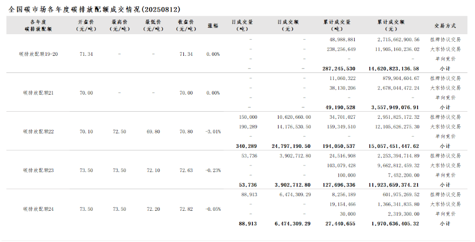 2025年1月1日至8月12日,全国碳市场碳排放配额成交量55,354,922吨,成交额4,097,792,337.13元。