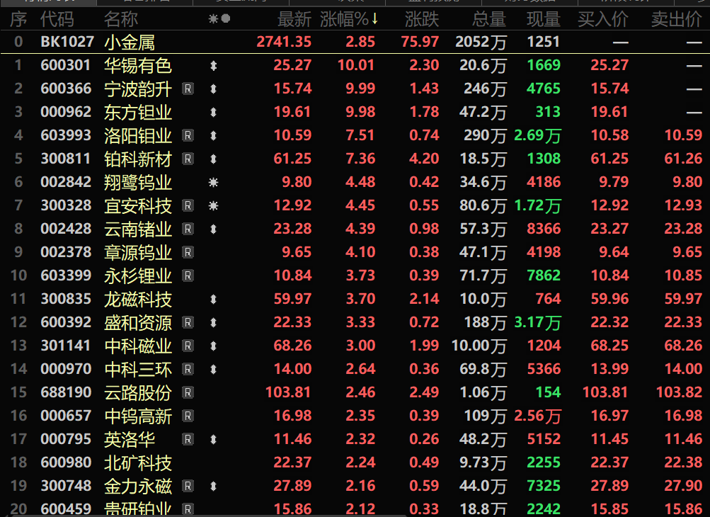 近来钨价受原料供应偏紧的支撑连番上涨;而镨钕价格因需求逐步回升、成交活跃度回暖,持货商低价出货的意愿明显降低,镨钕的市场报价持续上调;钼价依然受到钼精矿原料端偏紧的支撑,叠加钢招集中进场,市场成交改善,需求端口的增加也提振了钼价;钨钼、镨钕的偏强运行也带动了小金属板块的走高,截至8月13日收盘,小金属行业板块涨2.85%,个股方面:华锡有色、宁波韵升、东方钽业涨停,洛阳钼业、铂科新材、翔鹭钨业、云南锗业、章源钨业、永杉锂业以及龙磁科技等涨幅居前。