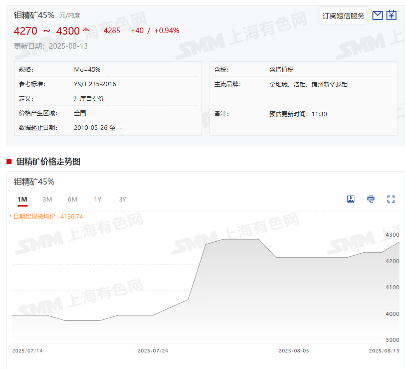 8月13日,钼产业链报价整体出现上移,其中,SMM45%钼精矿报4270-4300元/吨度,其均价为4285元/吨度,较前一交易日涨0.94%。4285元/吨度这一均价与其2024年12月31日的均价3605元/吨度相比,上涨了18.86%。