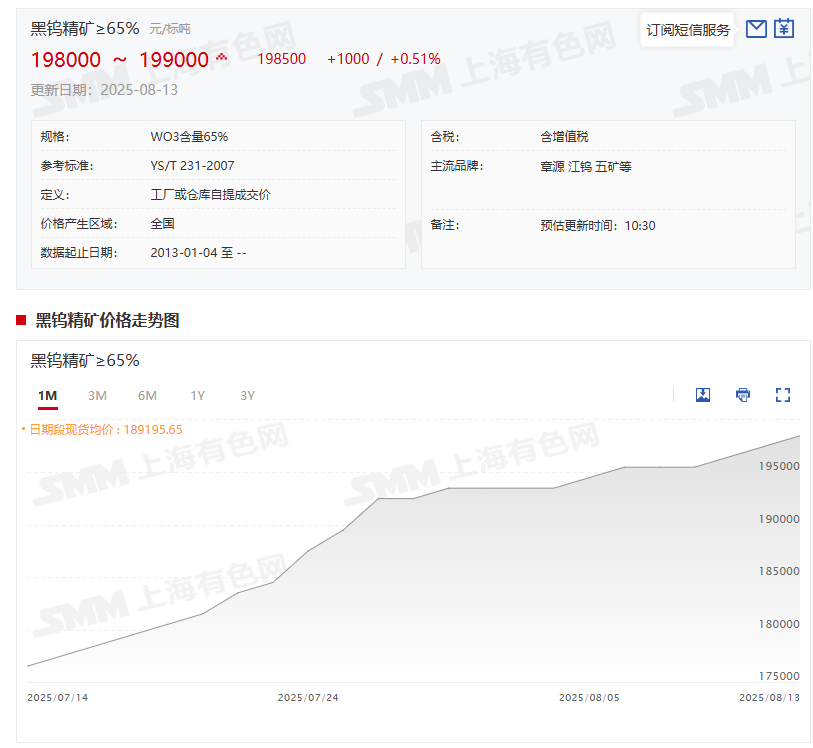 8月13日,受市场高品位矿流通紧张,下游补库困难,钨原料供应偏紧带动钨产业链价格继续上移,其中黑钨精矿(≥65%)价格为198000~199000元/标吨,均价报198500元/标吨,较其前一交易日上涨0.51%。而198500元/标吨这一均价与2024年12月31日的均价142750元/标吨相比,其均价今年以来上涨了55750元/标吨,今年以来的涨幅为39.05%。