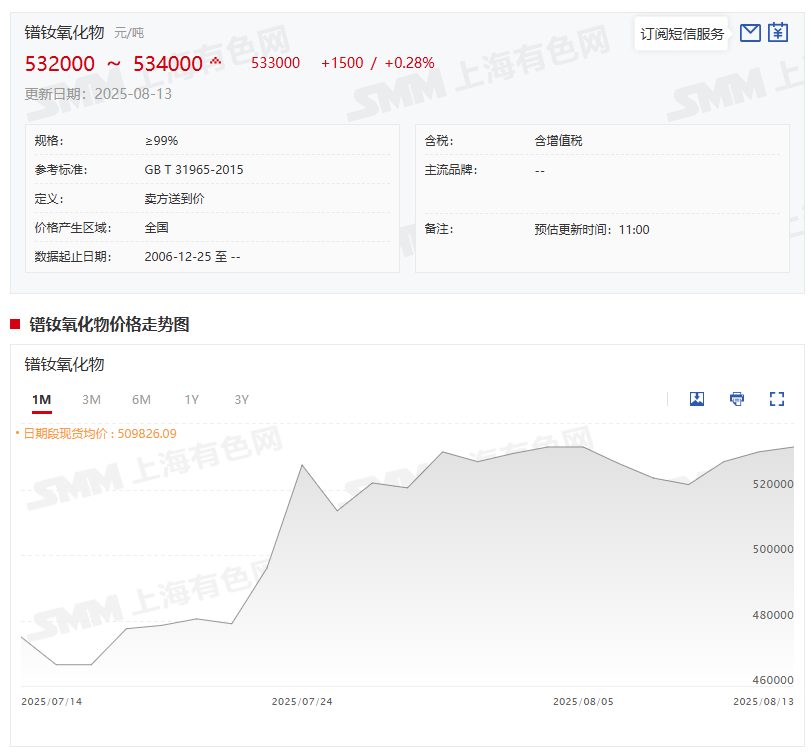 8月13日,SMM氧化镨钕的报价区间为53.2-53.4万元/吨,其均价为53.3万元/吨,较前一交易日上涨0.28%。至此,受市场成交氛围出现改善,持货商低价出货的意愿降低,这推动了氧化镨钕的报价迎来了三连涨。而氧化镨钕53.3万元/吨的均价与其2024年12月31日的均价39.8万元/吨相比,上涨了33.92%。