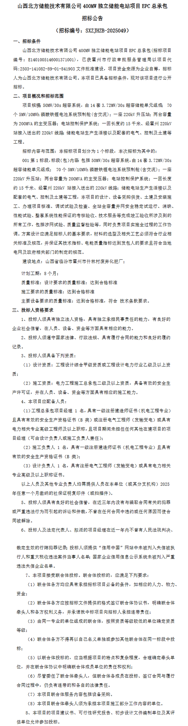 北极星储能网获悉,8月12日,山西北方储能技术有限公司发布400MW独立储能电站项目EPC总承包招标公告。项目规模: 50MW/30s超级电容系统,由14套3.72MW/30s超容储能单元组成 70个5MW/10MWh磷酸铁锂电池系统预制舱(含交流);一座 220kv 升压站;两台容量为 200MVA 的主变压器;电站控制保护系统;一回长度约15 千米、经州220k站接入送出的 220kV线路: 储能电站生产生活楼以及配套的电气、控制及土建等工程。