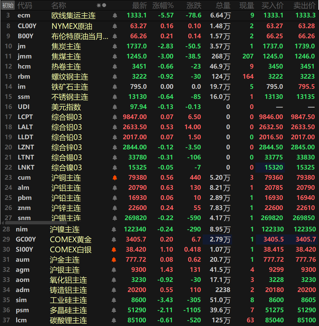 此外,碳酸锂主连跌0.61%。工业硅主连跌3.43%,多晶硅主连跌2.11%。欧线集运主连跌5.57%报1333.1。