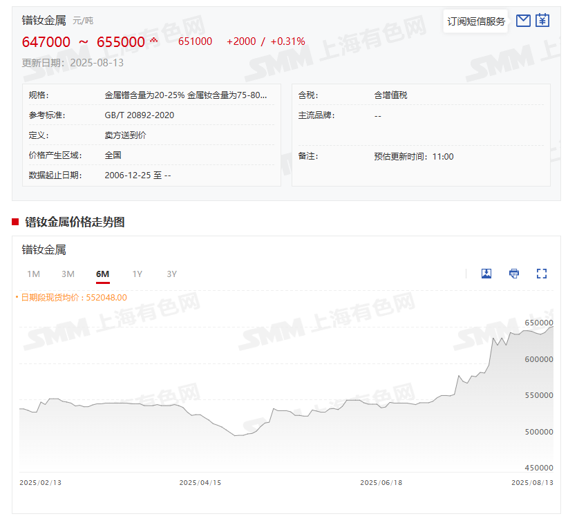 据SMM的报价显示,8月13日,稀土市场价格表现两级分化。氧化物市场方面:氧化镨钕价格小幅上调至53.2-53.4万元/吨,氧化镝价格下调至160-162万元/吨,氧化铽价格下调至695-700万元/吨。金属市场方面:镨钕金属价格继续上调至64.7-65.5万元/吨,镝铁合金价格下调至155-157万元/吨,金属铽报价下调至864-866万元/吨。