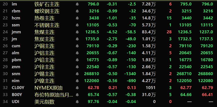 隔夜黑色系均飘绿,铁矿跌0.31%,不锈钢跌0.53%,螺纹跌0.99%,热卷跌1.01%。双焦方面:焦煤跌4.52%,焦炭跌2.75%。