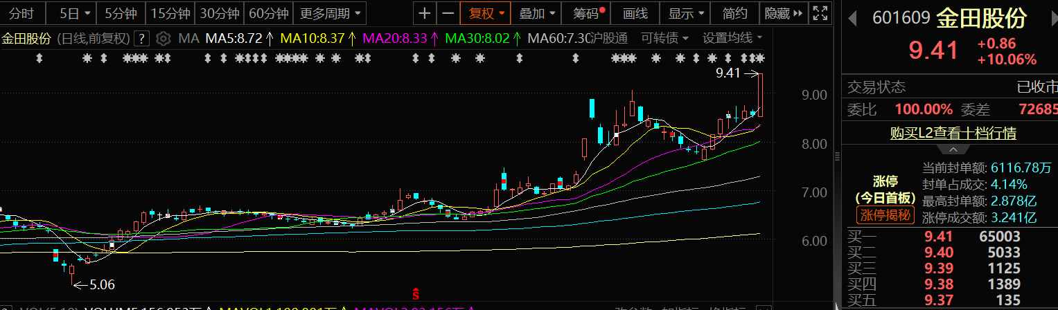 8月13日,金田股份以涨停报收,其收盘价为9.41元/股。