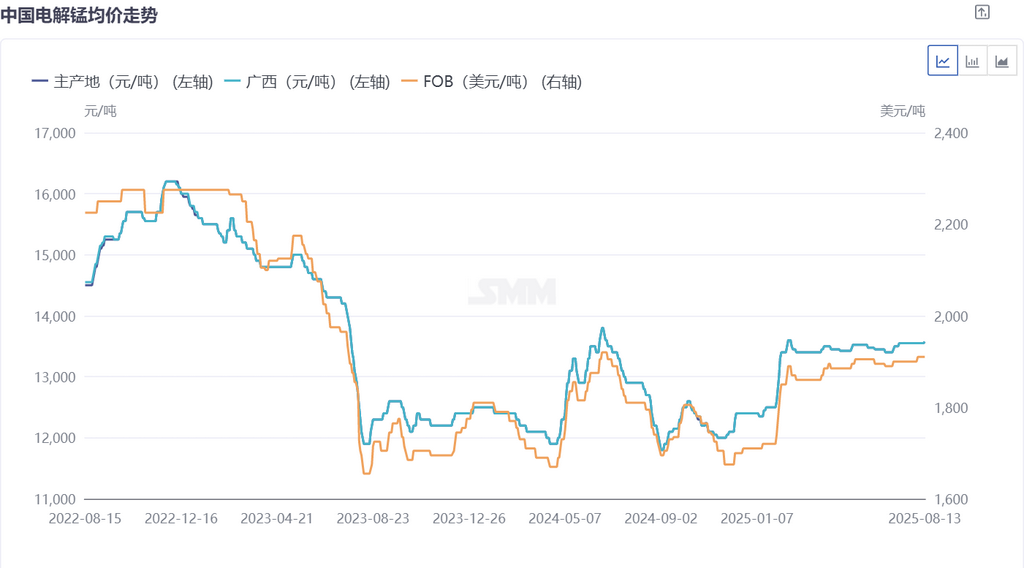 从价格表现来看,电解锰主产地现货均价稳定在 13500-13650 元 / 吨区间,较前期上涨后波动收窄;出口 FOB 价格维持在 1890-1930 美元 / 吨,环比持平。此前河钢集团 8 月电解锰招标价敲定 14150 元 / 吨,较 7 月上涨 100 元 / 吨,一度为市场注入利好情绪,推动现货价格小幅抬升,但后续涨势未能持续,逐步进入企稳阶段。