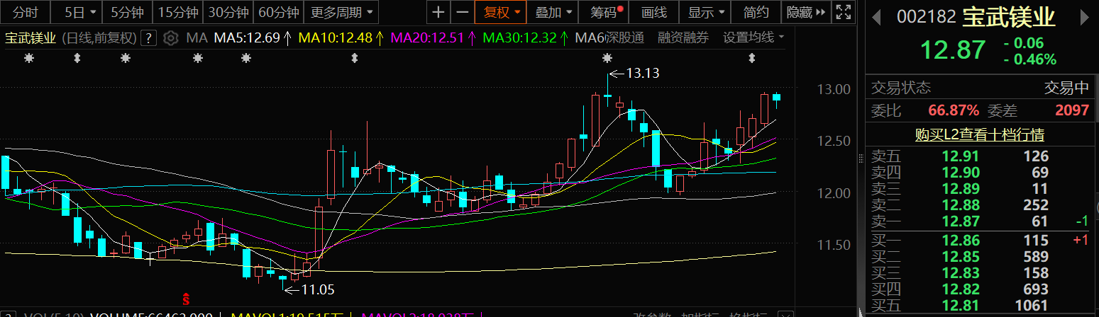 在经历了前三个交易日的持续上涨之后,宝武镁业8月14日的股价出现下跌,截至14日10:16分,宝武镁业跌0.46%,报12.87元/股。