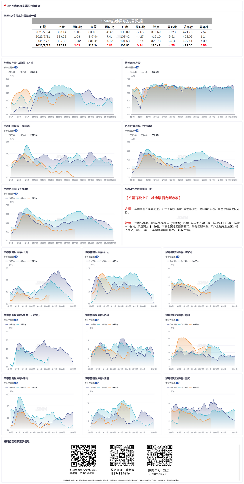 产量:本周热卷产量环比上升;中下旬部分钢厂有检修计划,预计8月热卷产量呈现前高后低走势。