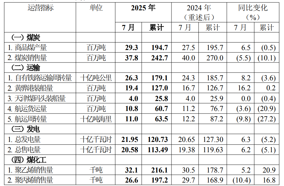 中国神华的公告显示:2025年7月,公司黄骅港装船量同比增长的主要原因,是到港资源量增加;聚丙烯销售量同比下降的主要原因,是根据聚烯烃产品需求和价格变化情况,及时调整产品销售量。2025年1-7月,本公司航运货运量及周转量同比下降的主要原因,是业务结构调整、航线结构变化;聚乙烯、聚丙烯销售量同比增长的主要原因,是上年同期煤制烯烃生产设备按计划检修导致基数较低。